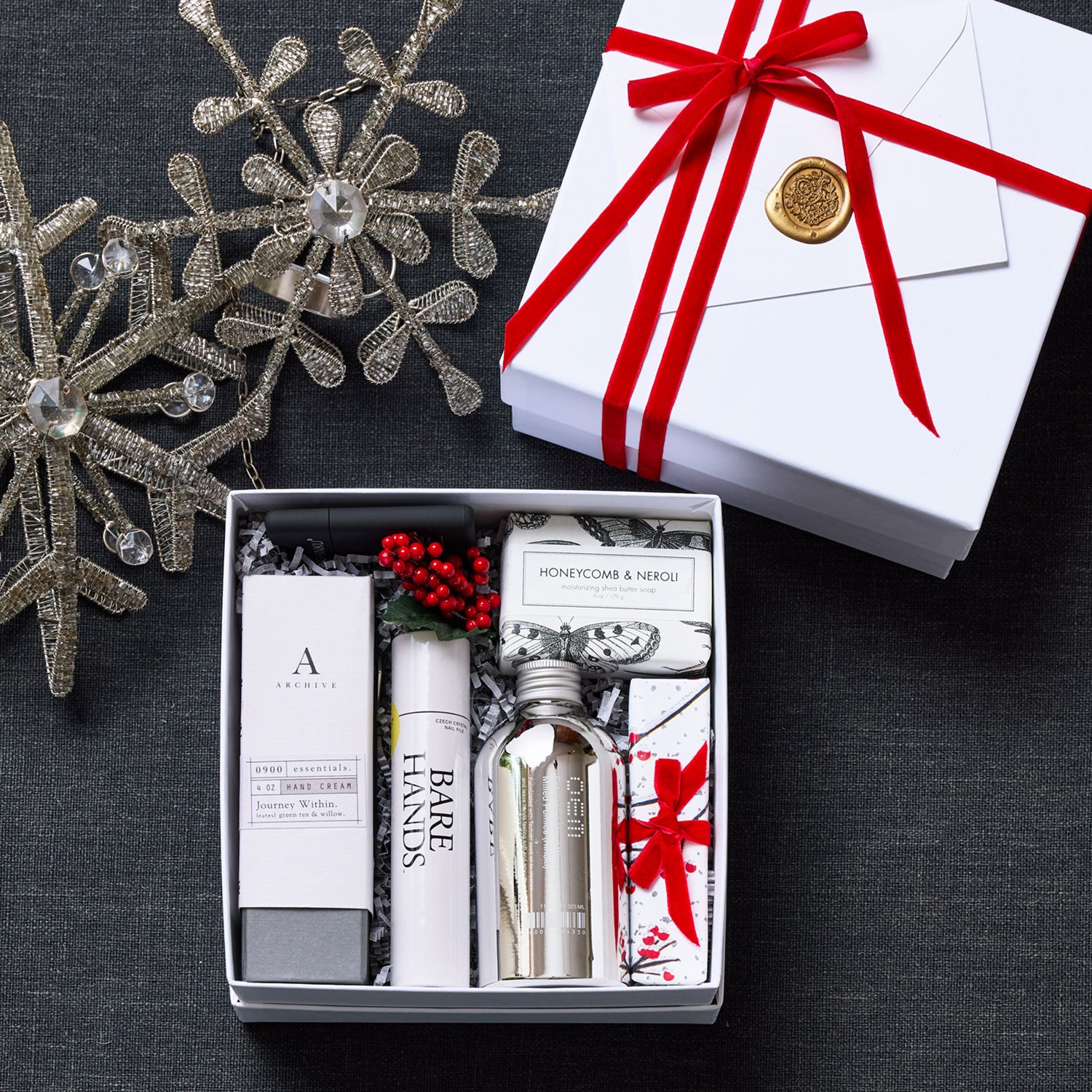 Each pinewood box is tied with a gray satin ribbon along with sprigs of Lavender. Our signature wax seal on handmade paper is the finishing touch.