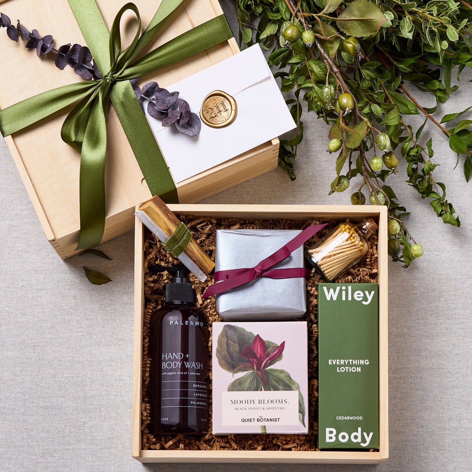 Each pinewood box is tied with a wide satin ribbon in festive red or green and layered with a playful tomato patterned accent ribbon. Our signature wax seal on handmade paper is the finishing touch.